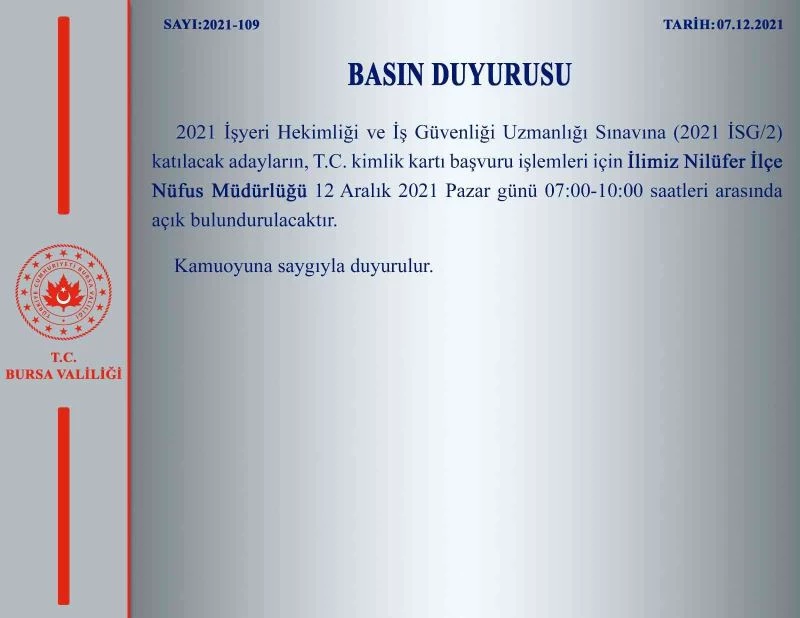 Bursa Valiliği, 2021 İşyeri Hekimliği ve İş Güvenliği Uzmanlığı Sınavı gerekçesiyle Nilüfer İlçe Nüfus Müdürlüğü’nün açık olacağını duyurdu. Bursa Valiliği’nden yapılan açıklamada, "2021 İşyeri Hekimliği ve İş Güvenliği Uzmanlığı Sınavına (2021 İSG/2) katılacak adayların, T.C. kimlik kartı başvuru işlemleri için İlimiz Nilüfer İlçe Nüfus Müdürlüğü 12 Aralık 2021 Pazar günü 07:00-10:00 saatleri arasında açık bulundurulacaktır" denildi.