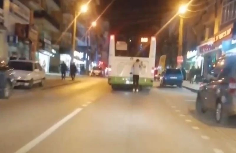 Bursa’nın merkez Osmangazi ilçesi Dikkaldırım Mahallesi’nde sefer yapan özel halk otobüsünün arkasına tutunarak patenleriyle kayan genç adeta ölüme davetiye çıkardı. Diğer araç sürücüsü ve vatandaşların tepkisini dikkate almayan gencin tehlikeli yolculuğu cep telefonu kamerasına anbean yansıdı.