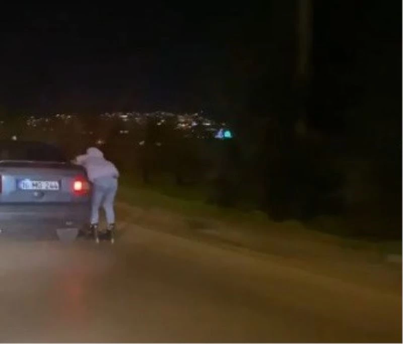 Bursa’da patenli bir gencin otomobile tutunarak tehlikeli yolculuğu, görenlerin yüreğini ağzına getirdi. Kendi canını hiçe sayarak seyahat eden gencin tehlikeli yolculuğu cep telefon kameralarına yansıdı.