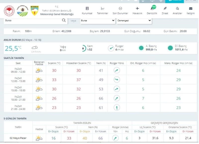 Meteoroloji Genel Müdürlüğü beş günlük hava durumunu açıkladı.Ü ç haftalık kısıtlamanın ilk pazar gününde Bursa’da sıcaklık rekoru bekleniyor. Verilere göre bu zamana kadar 2 Mayıs tarihinde yaşanan en yüksek sıcaklık 31,6 olarak ölçülürken, bugün termometrelerin en yüksek 33 dereceyi göstermesi bekleniyor. Öğle saatlerinde hissedilen sıcaklık ise 37 dereceyi bulacak.