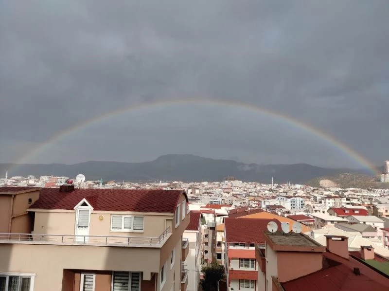 Bursa’da yağmur sonrası beliren gökkuşağı seyrine doyumsuz manzaralar ortaya çıkardı.