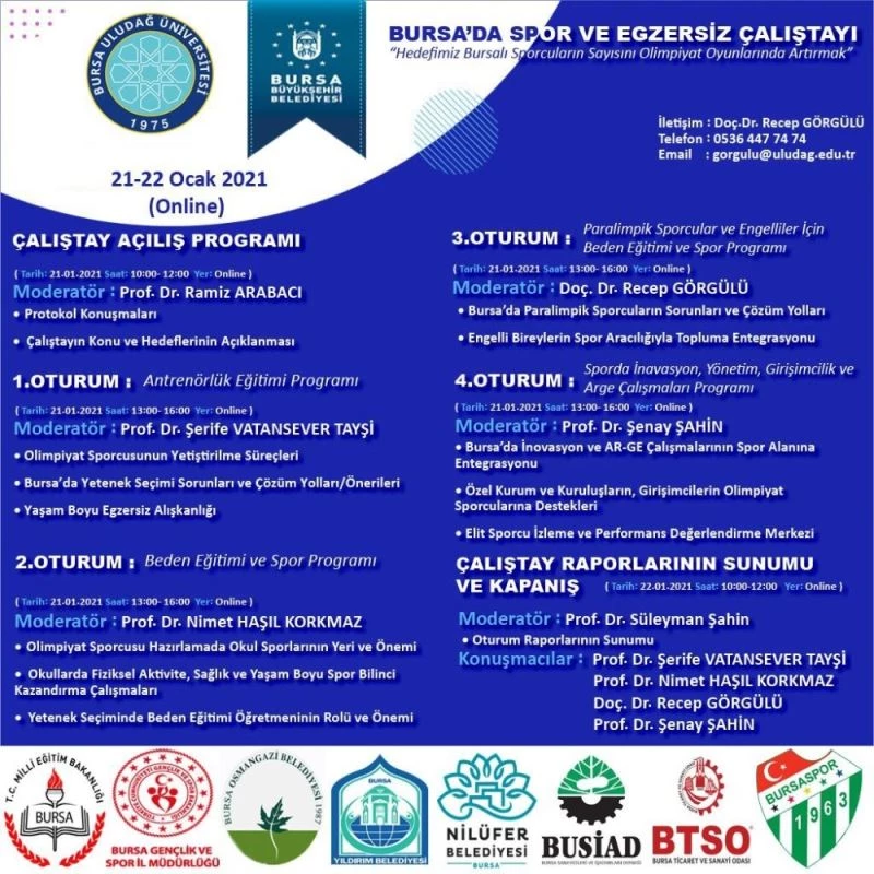 Bursa Uludağ Üniversitesi koordinasyonunda ve Bursa Büyükşehir Belediyesi’nin katkılarıyla düzenlenen “Bursa’da Spor ve Egzersiz Çalıştayı” 21-22 Ocak 2021 tarihlerinde online olarak gerçekleştirilecek. Bursa’nın olimpiyatlara aday sporcu sayısını arttırmak, sporla ilgili geleceği şekillendirmek, sorunlara ortak akılla çözümler sunmak amacıyla düzenlenen çalıştayda, alanında uzman akademisyenler, Antrenörlük Eğitimi, Beden Eğitimi ve Spor, Paralimpik Sporcular ve Engelliler için Beden Eğitimi ve Spor ile Sporda İnovasyon, Yönetim, Girişimcilik ve Ar-Ge Çalışmaları konu başlıkları üzerine sunum yapacak.