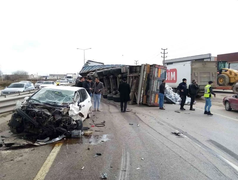 Bursa’nın İnegöl ilçesinde meydana gelen kazada otomobil ile çarpışan su yüklü tır devrildi, 1 kişi yaralandı.