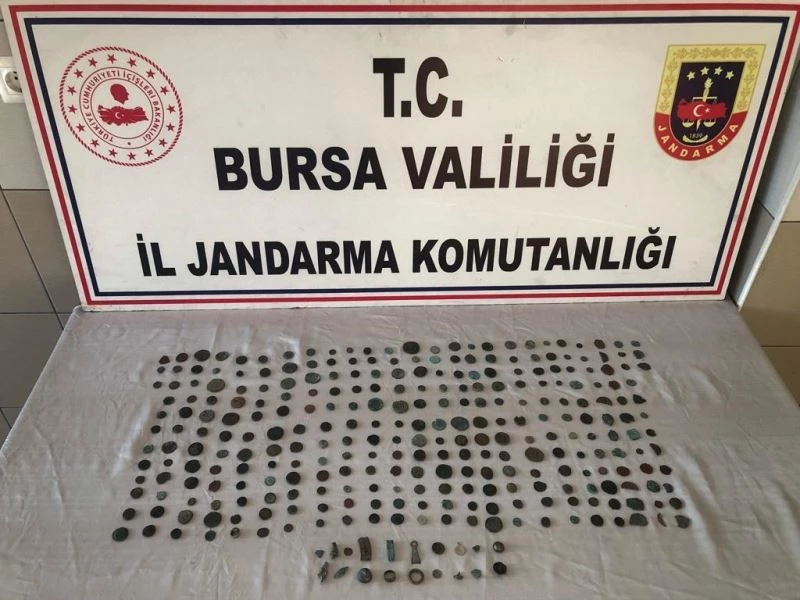 Bursa İl Jandarma Komutanlığı ekipleri İnegöl ilçesinde tarihi eser niteliğindeki eserleri satmak için müşteri arayan 2 kişiyi tespit ederek harekete geçti. Düzenlenen operasyon sonucu H.İ.A. ve İ.A. suç üstü yakalanarak gözaltına alındı. Yapılan aramalarda ise, 282 adet sikke, 7 adet kulplu kolye ucu, 6 adet obje, 2 adet çivi, 2 adet yüzük, 1 adet düğme ve 1 adet imame olmak üzere toplam 301 adet çeşitli dönem ve uygarlıklara ait sikke ve obje ele geçirildi. Şüpheliler hakkınca Cumhuriyet Savcılığı tarafından işlem başlatılırken, ele geçirilen sikkeler Bursa Müze Müdürlüğü’ne teslim edildi.