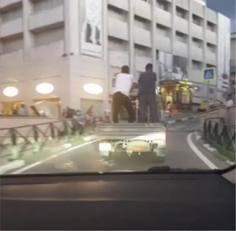 Olay, merkez Osmangazi ilçesi Atatürk Caddesi’nde meydana geldi. Edinilen bilgiye göre, kimliği henüz öğrenilemeyen 2 kişi, canlarını tehlikeye atarak kamyonetin arkasında seyahat etti.