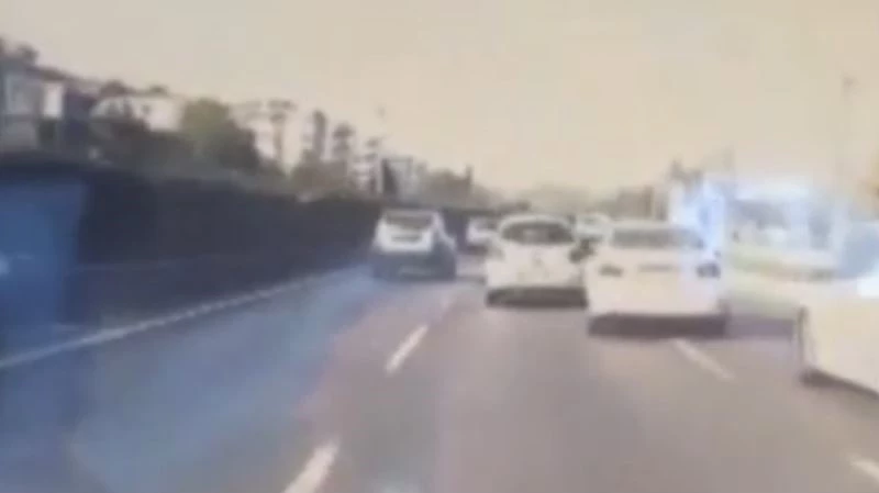 Bursa’da makas atarak yarışan otomobil trafiği tehlikeye düşürdü. O anlar başka bir aracın kamerasına yansıdı.