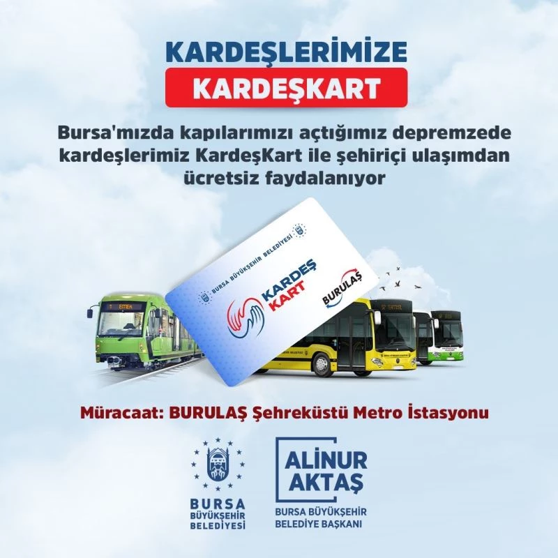 Bursa Büyükşehir Belediyesi, depremin yıkıcı etkiye yol açtığı 10 ilden Bursa’ya gelen deprem mağdurlarını şehir içi hatlarda ücretsiz taşıyacak. Uygulamaya geçen "Kardeş Kart" uygulaması ile depremzedeler, günlük 6 binişten ücretsiz yararlanacak.