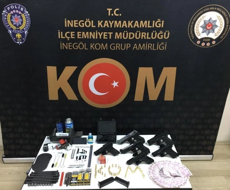 İnegöl İlçe Emniyet Müdürlüğü Narkotik Suçlar Mücadele Grup Amirliği ile Kaçakçılık ve Organize Suçlarla Mücadele (KOM) Amirliği ekipleri yasadışı silah ve uyuşturucuyla mücadele kapsamında yürüttüğü çalışmalar sonucunda Y.K. isimli bir kişinin silah üretimi yaptığı bilgisine ulaştı. Bunun üzerine harekete geçen ekipler fiziki ve teknik takibin ardından operasyon düzenledi. Operasyonda şüpheli Y.K.’ye ait ev ve iş yerinde yapılan aramada satışa hazır halde kurusıkıdan çevrilen 1 silah, 6 adet kurusıkı tabanca, 8 adet şarjör, 47 adet mermi ile tabanca yapımında kullanılan çok sayıda malzeme ele geçirildi.