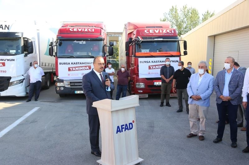 Sel felaketlerinden etkilenen afetzedelere ulaştırılmak üzere hazırlanan yardım tırları, Bursa Valisi Yakup Canbolat’ın katılımıyla afet bölgesine uğurlandı.