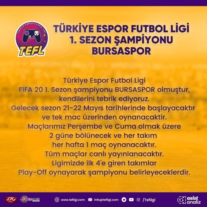 Bursaspor, Espor Futbol Ligi’nin ilk sezonunda şampiyonluğa ulaştı. FIFA 20’de 11 sanal futbolcuyu 11 kişinin kontrol ettiği oyunda, yeşil-beyazlılar zafer elde etmeyi başardı. FIFA 20’de ikinci sezon 21 Mayıs tarihinde başlayacak. Transferler ise 20 Mayıs’ta sona erecek.