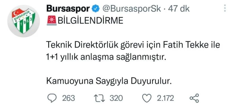 Bursaspor, teknik direktörlük görevi için Fatih Tekke ile anlaştığını sosyal medya üzerinden yaptığı açıklamayla duyurdu.