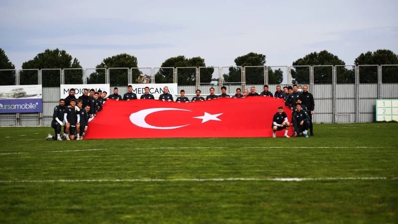 İstanbulspor maçı hazırlıklarına devam eden Bursaspor’da futbolcular, 23 Nisan Ulusal Egemenlik ve Çocuk Bayramı’nı unutmadı. Yeşil-beyazlı oyuncular, antrenman öncesi dev Türk Bayrağı açarak bu önemli günü kutladı.
