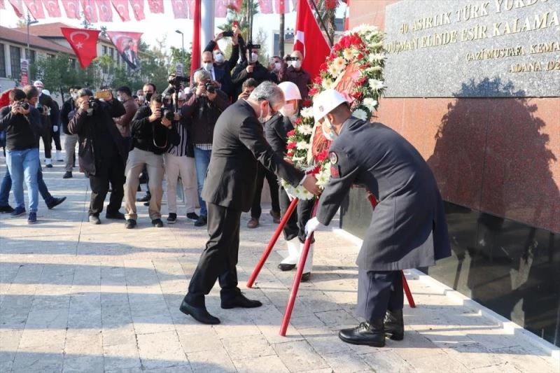 Hatay'da Cumhuriyet Alani'ndaki törende, Vali Rahmi Dogan, Garnizon ve 8. Komando Tugay Komutani Tugamiral Murat Firat ile Büyüksehir Belediye Baskani Lütfü Savas Atatürk Aniti'na çelenk sundu.