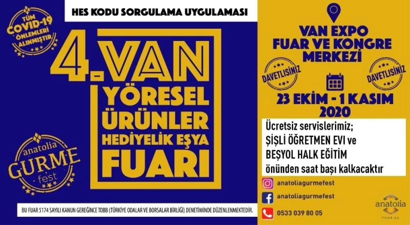 Türkiye’nin dört bir yanından üreticiler en taze ve en kaliteli ürünleri 4. Van Yöresel Ürünler ve Hediyelik Eşya Fuarı için hazır. 23 Ekim - 1 Kasım 2020 tarihleri arasında Van Organize Sanayi Bölgesi (Van OSB) yerleşkesinde bulunan Expo Fuar ve Kongre Merkezinde kapılarını açıyor. Karadeniz’in leziz peynir ve tereyağlarından, Ege’nin zeytin ve zeytinyağlarına, Adıyaman’ın peynirli helvasından, Aydın’ının incirlerine, Giresun’un fındık ezmelerinden, Maraş’ın baharatlarından, Isparta’nın Gül ürünlerinden, Hatay’ın sabunlarından, Mardin’in gümüşlerinden, Antep’in bakırlarına varana kadar tüm yöresel ürünler ve hediyelik eşyalar büyük Van fuarı için hazır.