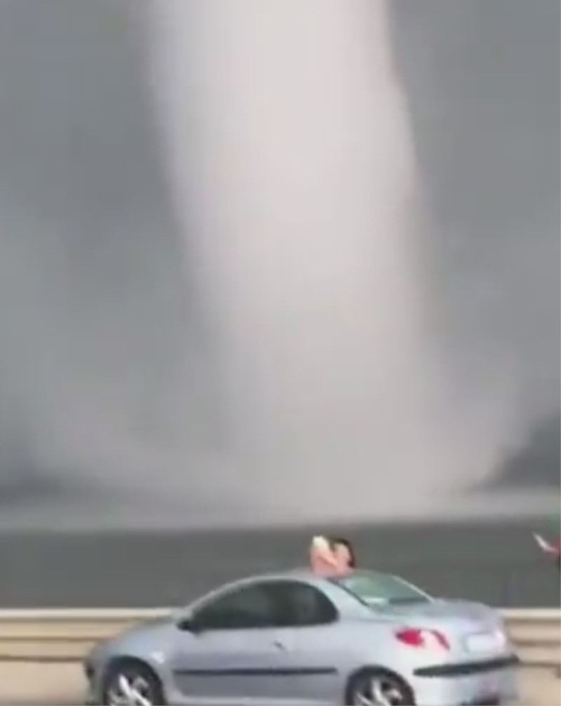 İstanbul’da bugün şiddetli yağmur ve dolu etkili oldu. Sağanak yağış öncesinde Büyükçekmece ilçesinde dev hortum ortaya çıktı. Hortum bölgede bulunan vatandaşların cep telefonu kameraları tarafından saniye kaydedildi. Bir kadının hortum ile selfie çekindiği anlar ise bir vatandaş tarafından saniye saniye görüntülendi. Kadının ve yanında bulunan bir kişinin yaklaşan hortuma karşı soğukkanlılığını koruması izleyenlerde şaşkınlık oluşturdu.