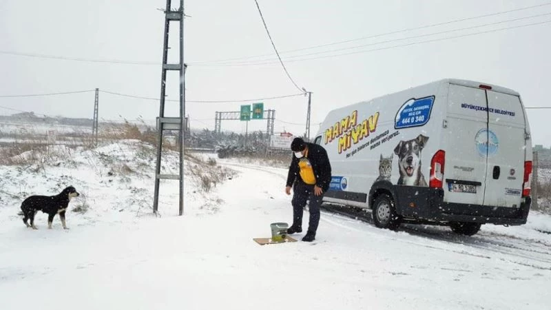 Kar yağışında yiyecek ve içecek bulmakta zorlanan sokak hayvanlarını da unutmayan Büyükçekmece Belediyesi ekipleri, ilçe genelinde sokak hayvanları için mama ve su servisi yaptı.