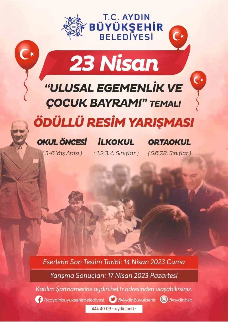 Aydın Büyükşehir Belediyesi, 23 Nisan’da ‘Ulusal Egemenlik ve Çocuk Bayramı’ temalı ödüllü resim yarışması düzenleyecek. Çocuklar eserlerini, 14 Nisan Cuma günü mesai bitimine kadar, Vali Yazıcıoğlu Kültür Merkezi’ne elden ya da kargoyla teslim edecekler.
