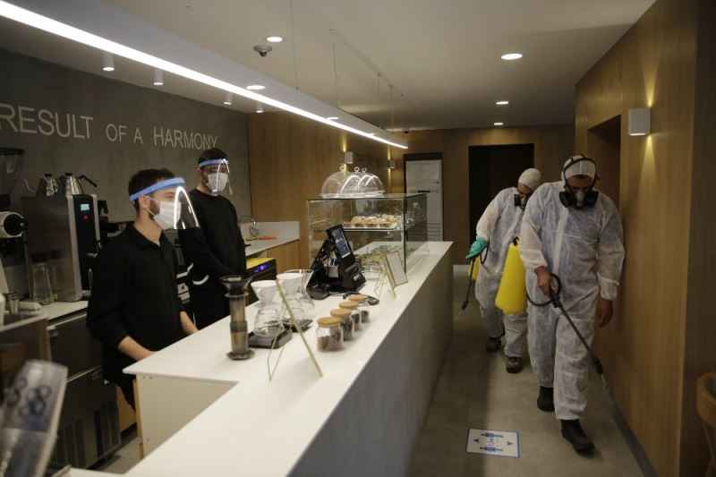 Çevre Koruma ve Kontrol Dairesi Başkanlığı’na bağlı dezenfeksiyon ekipleri kafelerde vatandaşın temas edeceği tüm bölgeleri dezenfekte ediyor. Oturma alanları, masa, sandalye, WC ve servis üniteleri zemini olmak üzere kafelerde dip bucak dezenfeksiyon çalışması gerçekleştirildi.