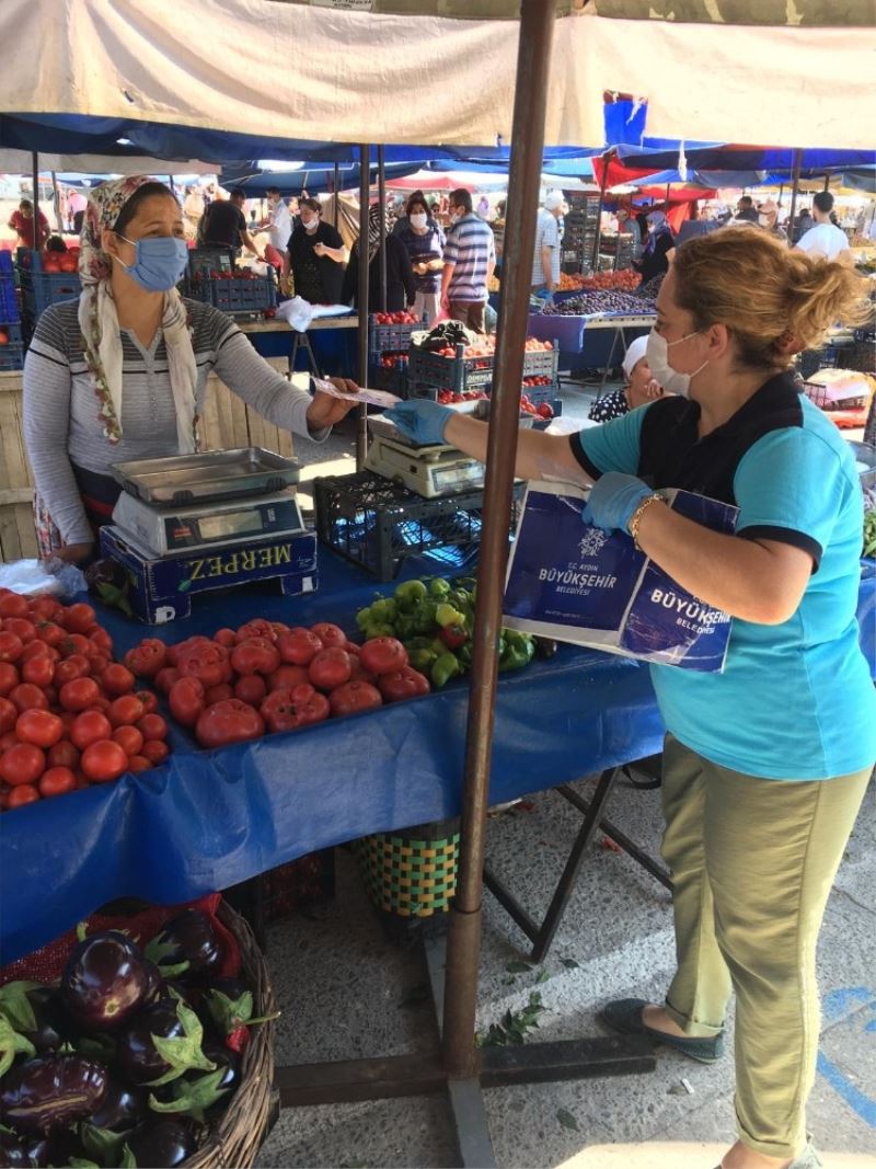 Büyükşehir, pazar yerlerinde maske ve dezenfektan dağıtımını sürdürüyor