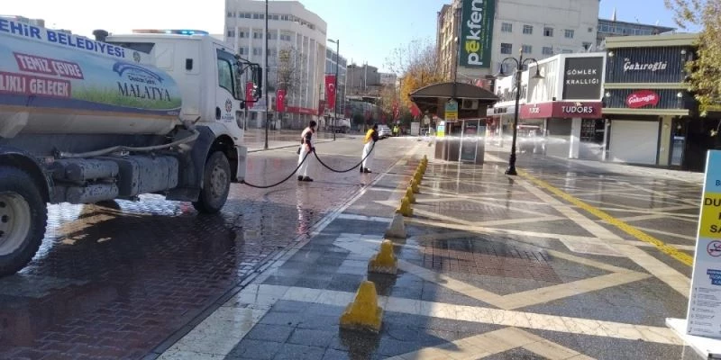 Malatya Büyükşehir Belediyesi hafta sonları sokağa çıkma kısıtlamalarının olduğu günlerde cadde ve sokakları köpüklü su ve solüsyonla dezenfekte ediyor. Korona virüs salgınına karşı çalışmalarını aralıksız bir şekilde sürdüren Malatya Büyükşehir Belediyesi Cadde ve Sokakların temizliğine de büyük önem veriyor.