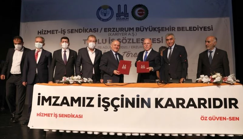 Erzurum Büyükşehir Belediyesi ve Hizmet-İş Sendikası arasında varılan mutabakatla işçi maaşlarına yüzde 14.2 oranında zam yapıldı. İbrahim Erkal Dadaş Kültür ve Sanat Merkezi’nde düzenlenen toplu iş sözleşme törenine, Erzurum Büyükşehir Belediye Başkanı Mehmet Sekmen, Hizmet-İş Sendikası Genel Başkan Vekili Hüseyin Öz, Özgüven-İş Sendikası Genel Başkanı Ömer Yılmaz, diğer yetkililer ve Büyükşehir Belediyesi çalışanları katıldı. Başkan Sekmen, törende yaptığı konuşmada, emek ve alın terinin önemine vurgu yaptı. Sekmen, “Bir husus var ki; onu asla inkâr edemez ve görmezden gelemeyiz. Bu husus ki; içinde emek var, gayret var. İçinde güç var, kuvvet var. İçinde hulusi niyetle çarpan kalpler var, samimiyet var, şükür var, hareket var, bereket var. Biz gerçekten çok şanslı bir yönetimiz. Çünkü gerek kurum içerisinde ve gerekse dışında, emekleriyle ve özverileriyle karıncaları bile kıskandıran çalışanlarımız var, kardeşlerimiz var” dedi.
