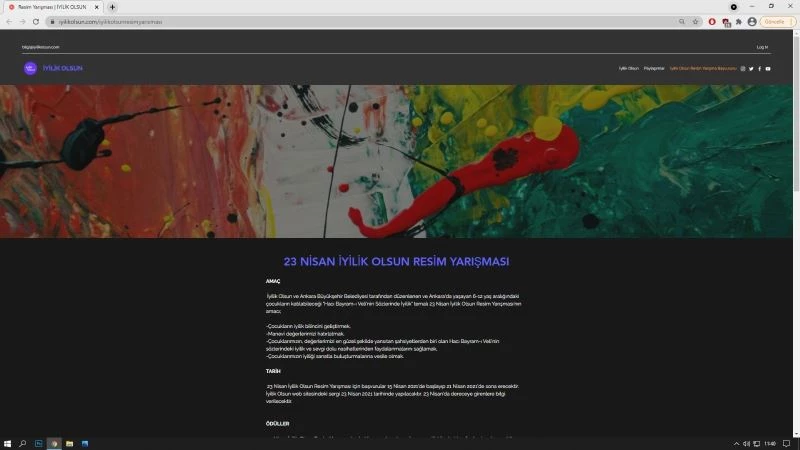 Ankara Büyükşehir Belediyesi pandemi sürecinde sivil toplum kuruluşlarıyla iş birliği yaparak milli bayramları çeşitli etkinliklerle kutlamaya devam ediyor. İyilik Olsun ile birlikte bu yıl 23 Nisan Ulusal Egemenlik ve Çocuk Bayramı nedeniyle ‘23 Nisan iyilik olsun’ adlı bir resim yarışması düzenleyen Büyükşehir Belediyesi, Ankara’da yaşayan 6-12 yaş arası çocukların evlerinde hazırladıkları resimlerle 21 Nisan tarihine kadar başvuru yapabileceğini duyurdu. Ankara’da yaşayan 6-12 yaş arası çocuklar, 21 Nisan tarihine kadar “iyilikolsun.com” adresi üzerinden yarışmaya başvuruda bulunabilecek.