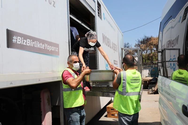 Antalya Büyükşehir Belediyesi, Manavgat ve Gündoğmuş’ta yangında zarar görenler ve yangın bölgesinde çalışan işçiler için her gün 3 öğün yemek dağıtımı yapıyor.