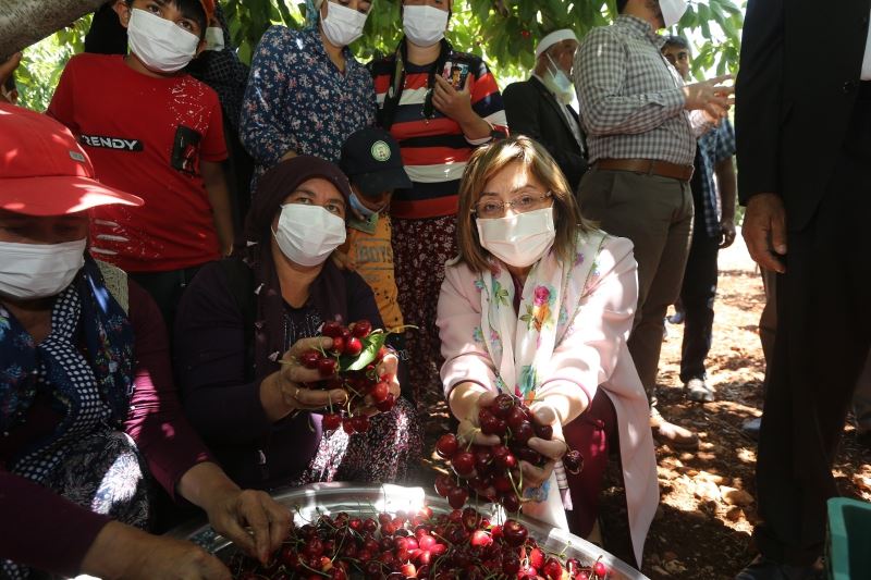Etkinliğin devamında kadın çiftçilerle bir araya gelerek kiraz hasadına katılan Büyükşehir Belediye Başkanı Fatma Şahin, ağaçtan kiraz topladı. Çiftçilerle sohbet etti.