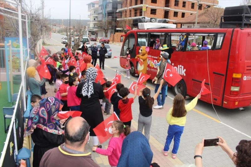 Salgın nedeniyle sanatlarını icra edemeyen yerel sanatçılar da mobil otobüs sahnesinden çocuklara şarkılar söyledi.