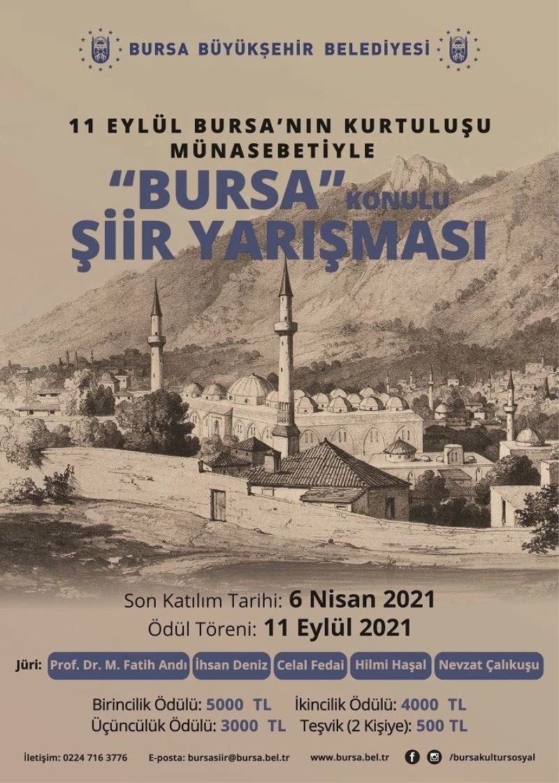 Büyükşehir Belediyesi’nin 11 Eylül Bursa’nın kurtuluşu münasebetiyle düzenlediği ‘Bursa’ konulu şiir yarışmasında ilk başvurular, 11 Eylül 2020 tarihinde alınıyor. 18 yaşını dolduran herkesin 6 Nisan 2021 tarihine kadar katılabileceği yarışmanın neticesi 11 Eylül 2021 tarihinde açıklanacak. Dereceye giren eserlerin sahiplerine para ödülü verilecek.