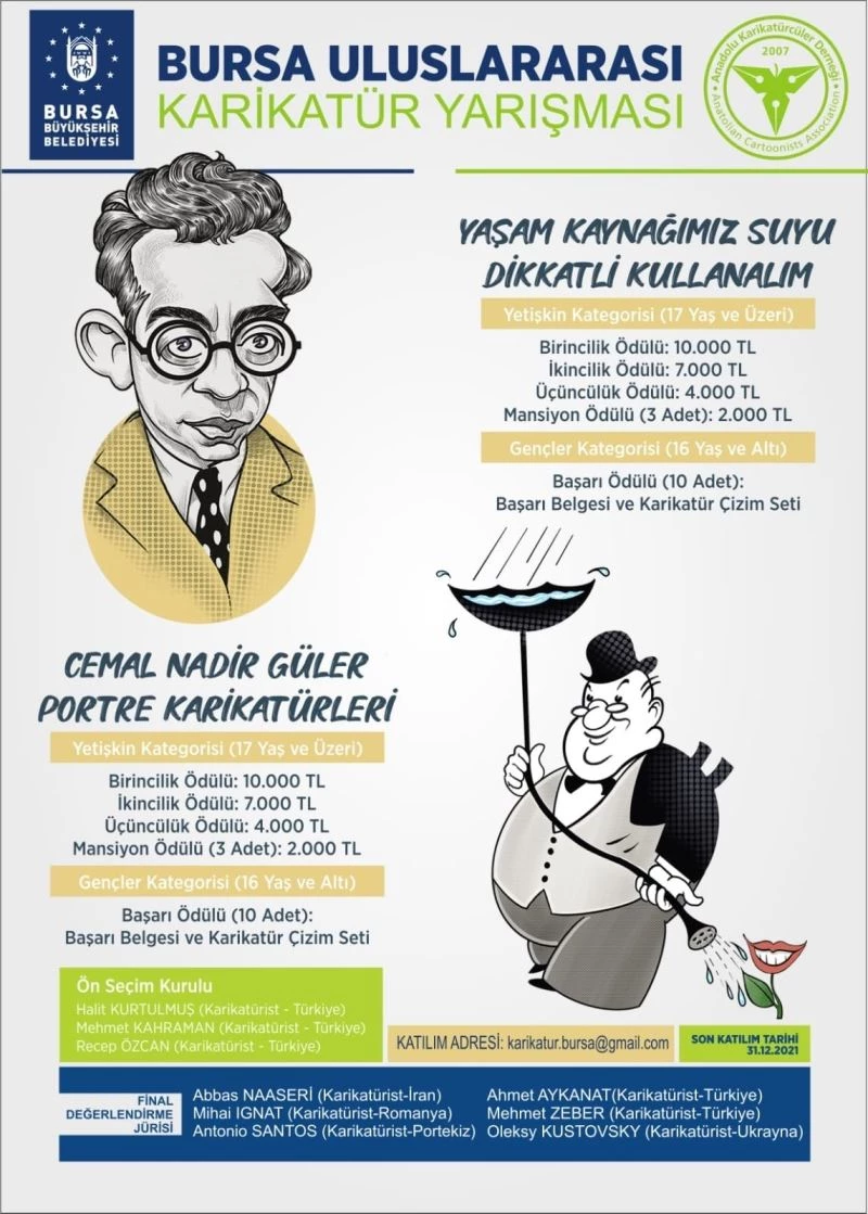 Büyükşehir Belediyesi’nin Anadolu Karikatürcüler Derneği işbirliğiyle düzenlediği yarışma, ‘Hayat kaynağımız suyu dikkatli kullanalım’ ve ‘Cemal Nadir Güler Portre Karikatür’ olmak üzere iki ayrı konu başlığında yapılacak. Yarışmacılar, ‘Suyu dikkatli kullanalım’ başlığında ‘Suyun Geri Dönüşümü, Alternatif Su Kaynakları, Su Kaynaklarının Verimli Kullanılması, Yağmur Hasat Sistemleri, Şehir ve Su, Barajlar ile Su Tasarrufu’ konularını ele alabilecek. Yarışma 17 yaş ve üzeri yetişkinler, 16 yaş ve altı gençler olmak üzere iki kategoride yapılacak. Amatör ve profesyonel bütün dünya çizerlerine açık olan yarışmada çizim tekniği serbest olacak. Yarışmacılar her iki konu başlığı için de en fazla 3’er eser gönderebilecek. Karikatürler 300 dpi çözünürlükte, “mutlaka taranmış” ve “jpeg” formatında ve en fazla 3 MB büyüklüğünde olacak. Eserler karikatur.bursa@gmail.com adresine e-posta yoluyla gönderilecek. Son iştirak tarihinin 31 Aralık 2021 olduğu yarışmada ön elemeyi geçerek finale kalan çalışmalar; benzer, kopya ve çalıntı itirazları için, ileriki bir tarihte internet üzerinden kamuoyuna duyurulacak.