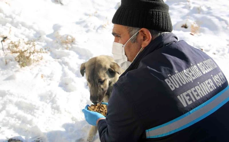 Erzurum Büyükşehir Belediyesi ekipleri, aşırı soğuklar nedeniyle yiyecek bulmakta güçlük çeken yaban hayatı ve köpekler için doğa ve kent merkezinde belirlenen alanlara yem bıraktı.