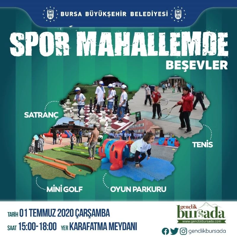 Spor Mahallemde etkinliği 1 Temmuz Çarşamba gününden itibaren başlayacak ve yaz boyunca her hafta Çarşamba günü 15.00 - 18.00 saatleri arasında Bursa’nın farklı bölgelerinde hizmet verecek. Spor Mahallemde etkinliğinin ilki Beşevler Karafatma Meydanı’nda 15.00 - 18.00 saatleri arasında yapılacak.