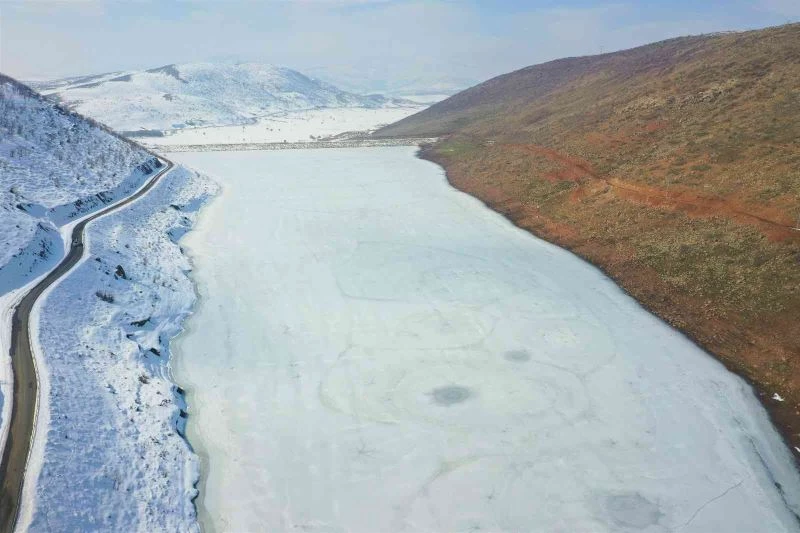 Bingöl’ün Solhan ilçesinde bulunan Şimşirpınar Göleti, kar yağışı sonrası hava sıcaklığının eksilere düşmesi ile tamamen buz tuttu. Dron ile havadan görüntülenen barajda ortaya çıkan tablo izleyenleri mest etti.