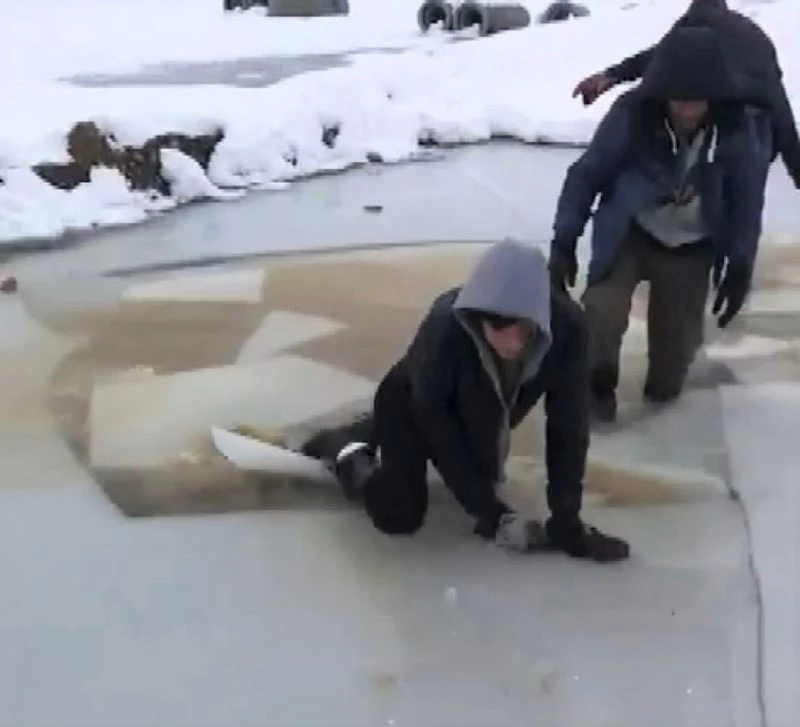 Görüntülerde çocukların buz üzerinde oynaması ve buzun kırılıp çocukların suyun içine düştüğü görülüyor. Soğuk suda sırılsıklam olan çocuklar, daha sonra düştükleri yerden çıkmayı başardı.