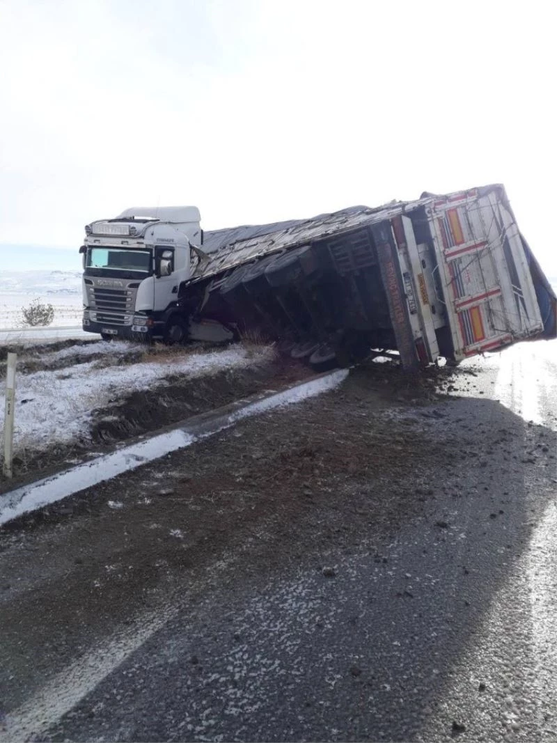 Sivas’ta yoldaki buzlanma nedeniyle kontrolü kaybeden tır yola devrildi.