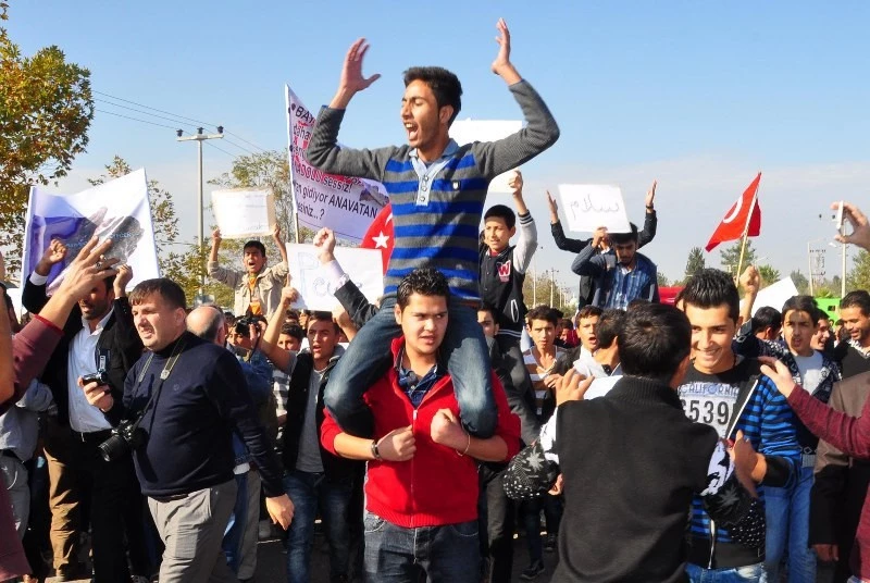 Osmaniye Konaklama Tesislerinde kalan ve tamamı Bayırbucak Türkmenlerinden oluşan sığınmacılar, Rus Savaş uçakları tarafından Türkmendağı`na yapılan hava saldırılarını protesto etti. Çadır Kenttin girişinde toplanan ve çoğunluğunu genç ve öğrencilerden oluşan kadın erkek binden fazla kişi Türk ve Türkmen Bayrağı ve pankartlarla Cevdetiye Osmaniye yoluna çıkarak sloganlar atarak yürüyüşe geçti. `Rusya Türkmen dağından çekil`, Kahrolsun Rusya` ve `Katil Rusya` sloganları atarak ilerleyen öfkeli gurup bir süre yolu trafiğe kapattıktan sonra basın açıklaması yaptı. Kamp Okulu Müdürü Ahmet Güllü, "O dağ namus, o dağ şeref, o dağ ikinci Çanakkale ve biz o dağdan Türkmen Dağından yeniden bir Sakarya olup ayağa kalkacağız inşallah. Bugün, buradan feryadımızı haykırıyoruz, bugün yetim kalan binlerin, kimsesiz kalan dulların, Şahadete eren yiğitlerin feryadını haykırıyoruz. Duymayan kulaklara, görmeyen gözlere, nasırlaşmış kalplere Bayır Bucağın feryadını haykırıyoruz. Çileyi haykırıyoruz, sahipsiz kalmış pınarların sesinden. Sana geldik tanrı misafiri; ecdat yadigarı, sana geldik. Kimimiz yok, kimsemiz yok; bir Yüce yaradan ve sen "Gardaş" dedik, yoldaş dedik sana geldik. Bin yıldır nöbette zayıf düştük bugün, yedi düvel üstümüze gelir, can ver, el ver, gül yüzümüze gardaş; biz gülmeyi unuttuk... Bayır bizim bucak bizim. Biz barış isterken savaş geldi. Biz vatan isterken, gurbet geldi. Biz yurt derken işgal geldi. Rus geldi, Fars geldi, Çin geldi, Hizbullah geldi, Şia geldi, Esad geldi ne kadar kana susamış kansız varsa hep geldi. Bayır Bucak yanıyor, Bayır Bucak ağlıyor, Bayır Bucak yok oluyor. Dünyanın gözü önünde insanlar katlediliyor. Gökten ölüm yağıyor, yerden kan fışkırıyor ve ne hazindir ki medeni dünya sadece izliyor, izliyor, izliyor... Bu zor günlerimizde T.C Cumhurbaşkanı Sayın Recep Tayip Erdoğan`dan tutunda, T.C Başbakan, sayın Ahmet Davutoğlu`na yüreği bizim için atan, sınıra dayanan yardım kuruluşlarına, derneklere, Türkiye`nin her köşesinden Türkmen`in çığlığına ses veren tüm Türk halkına teşekkürü borç biliriz." diye konuştu. Açıklamanın ardından saldırılarda hayatlarını kaybeden Türkmenler için dua edildi. Gurup olaysız bir şekilde yaya olarak çadır kente geri döndü.