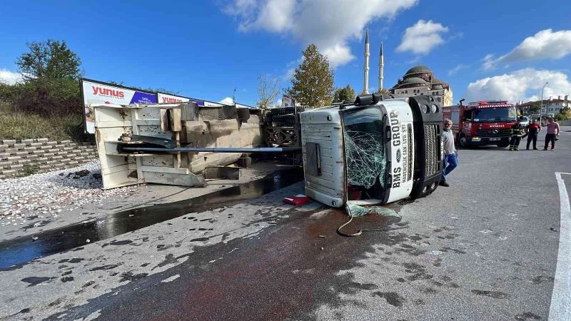 Düzce’de sürücüsünün kontrolünden çıkan çakıl taşı yüklü kamyon kavşakta devrildi. Kazada 1’i ağır 2 kişi yaralandı.