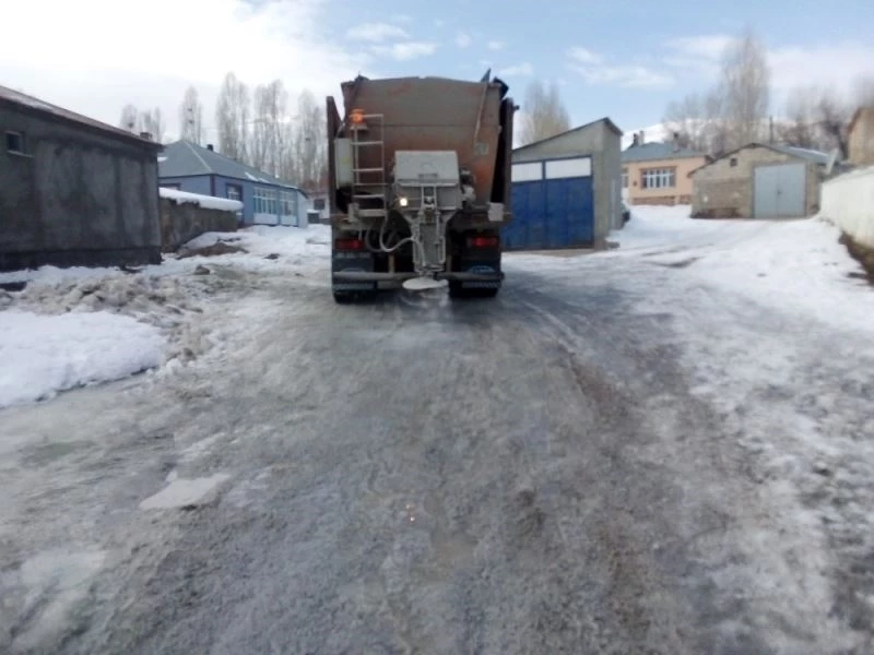 Van’ın Çaldıran Belediye Başkanlığı karla mücadele ekipleri buzlanmaya karşı kırsal mahalle yollarında tuzlama çalışmalarını sürdürüyor.