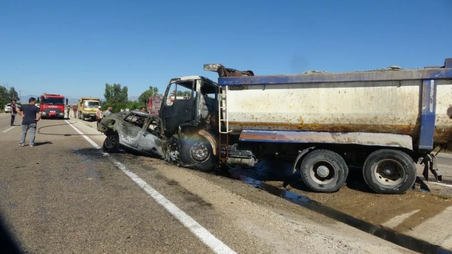 Adana'nın Kozan ilçesinde kamyon ile çarpışan otomobilin sürücüsü araçta çıkan yangında yanarak hayatını kaybetti.