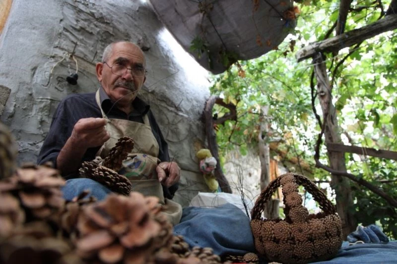 Antalya’nın Akseki ilçesinde yaşayan 83 yaşındaki Hasan Erdoğan, ormandan topladığı çam kozalaklarını adeta sanat eserine çeviriyor. 55 yıl yaptığı tahta kaşık sanatını astım hastalığı sebebiyle bırakıp oksijen deposu ormanlarıyla ünlü Akseki ilçesine gelen Erdoğan, burada 20 yıldır kozalaklardan sepet, avize ve tabak yapıyor. Erdoğan yaptığı el sanatı ürünleri 50 TL ile 200 TL arasında satıyor.