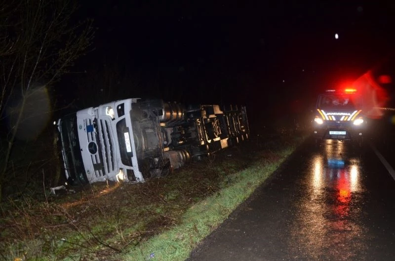 Tekirdağ’ın Malkara ilçesinde sağanak yağışta sürücüsünün direksiyon hakimiyetini kaybettiği tır, şarampole devrildi. Yaralanan tır şoförü hastaneye kaldırıldı.