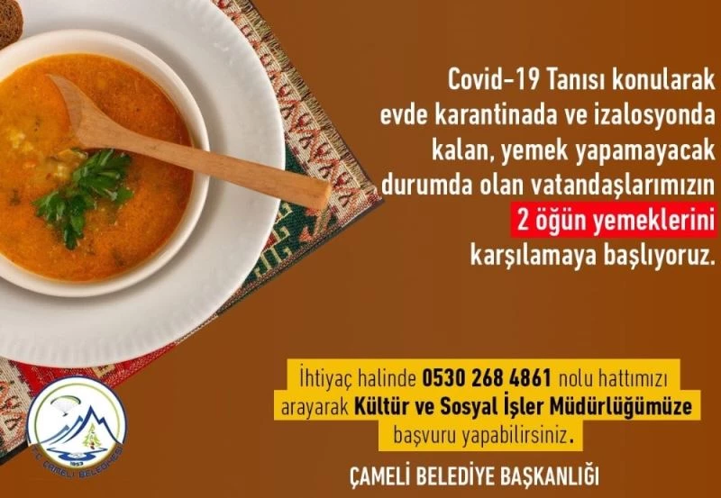 Çameli Belediyesi, korona virüs testleri pozitif çıkan ya da temaslı oldukları gerekçesiyle zorunlu izolasyonda kalan yemek yapamayacak durumda olan vatandaşlara karantina süresi boyunca sıcak yemek hizmeti verecek.