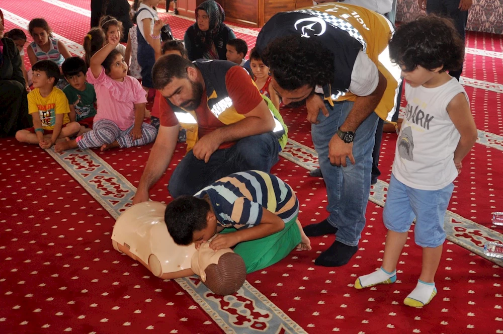 Osmaniye`de yaz kursları kapsamında camilerde din eğitimi alan öğrencilere, uygulamalı ilk yardım eğitimi verildi. Acil Tıp Teknisyenleri ve Paramedik Derneği (ATT DER) Osmaniye Şube Başkanı İlyas Yıldır ve beraberindeki ekip tarafından Zafer Camii`nde düzenlenen eğitim seminerinde, çocuklara, temel yaşam desteği ve solunum yolu tıkanıklıkları hakkında ayrıntılı sunum yapıldı. Diyanet İşleri Başkanlığının yapmış olduğu bilinçlendirme projesi kapsamında düzenlenen seminerde öğrencilere, nabzı durmuş bir yaralıya il yardım olarak uygulanan kalp masajı ve suni teneffüs, maket insan üzerinde uygulamalı olarak öğretildi. Osmaniye İl Müftülüğü Din Hizmetleri Uzmanı Sabri Erdoğan, camilerin çocukları çok özlediğini ve yaz kursları başlamasıyla birlikte bu özlemin sevinç ve neşeye dönüştüğünü belirterek, "Sizlerinde çok neşeli olduğu gözlerinizden okunuyor. İnşallah camilerimizde hocalarımızı en güzel şekilde dinleyip, dini bilgilenirimizi tazeleyerek cami ile buluşarak en güzel şekilde değerlendireceğinizi umuyorum.Günlük hayatta ihtiyacımız olacak ilk yardım konusunda 112 Acil Servis ekibimiz sizleri bilgilendirecekler. Umarım hayırlı ve faydalı eğitim olur. Hepinize başarılar diliyorum." dedi. Acil Tıp Teknisyenleri ve Paramedik Derneği (ATT DER) Osmaniye İl Başkanı İlyas Yıldır ise Diyanet İşleri Başkanlığının başlatmış olduğu sosyal etkinliklere,sağlık eğitimi ile destek olduklarını belirterek, "Yaz kuran kursundaki çocuklarımıza ilk yardım bilinçlendirme eğitimi verdik. Temel yaşam desteği ve tıkanmalarda müdahale eğitimini uygulamalı olarak gösterdik. Eğitimimiz sırasında 112 acil servis gelene kadar hastaya neler yapmaları ve sağlık görevlilerine nasıl bilgi verilmesi gerektiği noktasında anlatımlarımız oldu. Bir insanın kurtulması, bizler için çok önemlidir. İnşallah herkes eğitimden faydalı bir şekilde ayrılmıştır. " diye konuştu. Zafer Camii İmam Hatibi Adem Yıldır ise yaz Kur`an Kursları kapsamında 150 öğrencinin eğitim aldığını, sosyal etkinliklerin ilerleyen günlerde, farklı konularda devam edeceğini sözlerine ekledi.