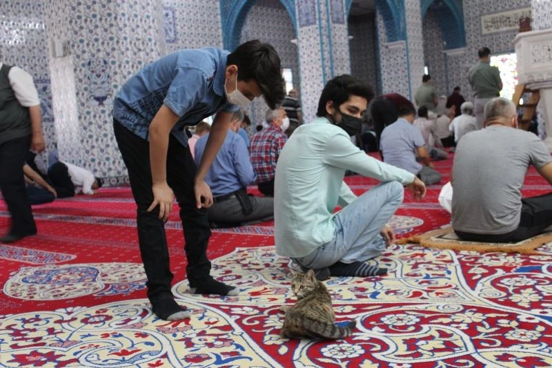Iğdır’da Ulu Cami’de kılınan cuma namazı sırasında camiye giren bir kedi çocukların neşe kaynağı oldu.
