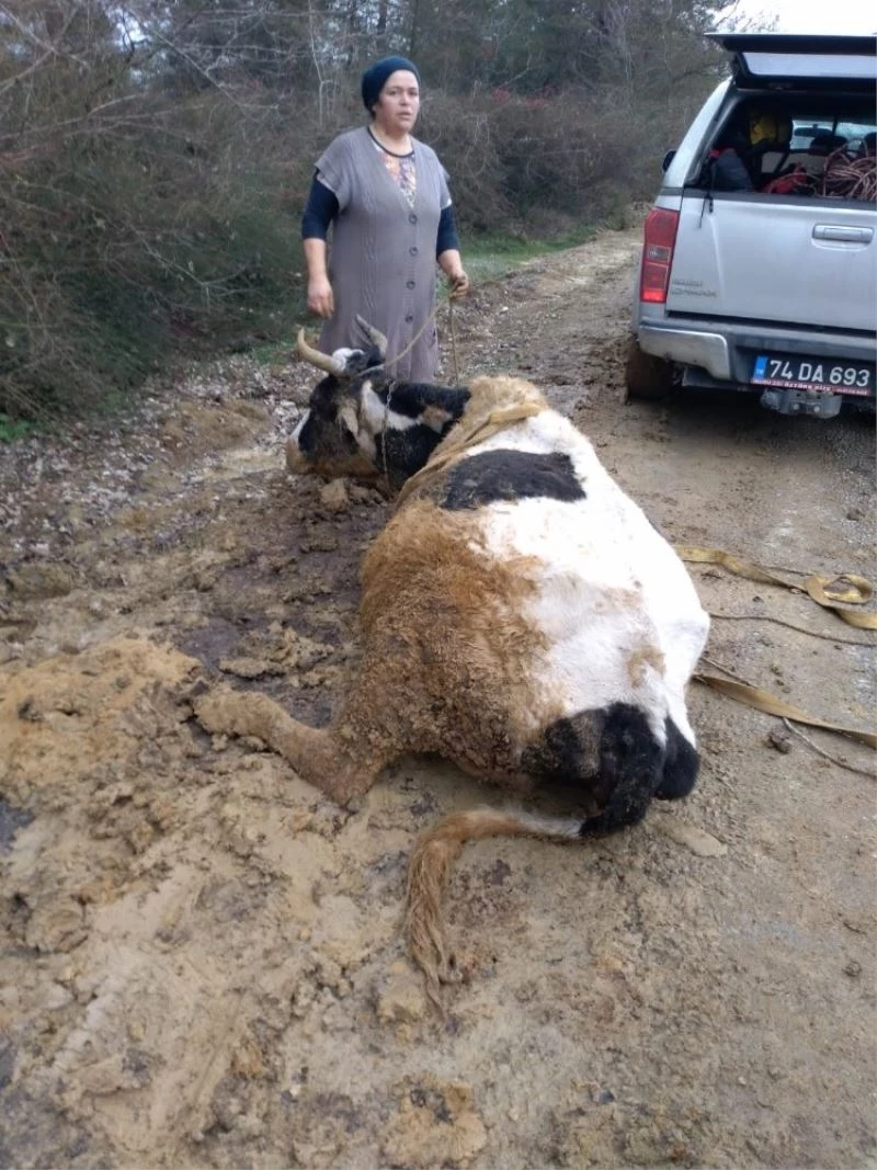 Bartın’da çamura saplanan inek, İl Afet ve Acil Durum Müdürlüğü (AFAD) ekiplerince yapılan çalışmalar sonucu kurtarılarak sahibine teslim edildi.