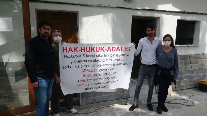 Büfede çalışan personel hazırladıkları ’Hak, hukuk, adalet’ başlıklı pankartta: ’Hizmet Grupları A.Ş. kendi çıkarları için iş yerimizi yıkmış, su ve elektriğimizi keserek zorbalıkla bizleri tahliye etmek istemektedir. Adalete güveniyor, hukukun üstünlüğü ile hakkımızın verildiği gün hizmete devam edeceğimiz günü bekliyoruz’ diyerek, şirket yetkililerine tepki gösterdiler.