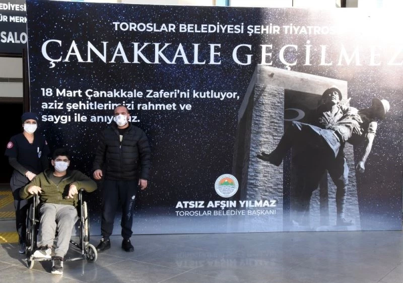 Toroslar Belediyesi Şehir Tiyatrosu, sahnelediği "Çanakkale Geçilmez" adlı tiyatro oyununda özel bir konuğunu ağırladı. Bedensel engelli 13 yaşındaki Mustafa Kahraman, Toroslar Belediye Başkanı Atsız Afşın Yılmaz’ın desteğiyle oyunu ailesiyle birlikte izledi.