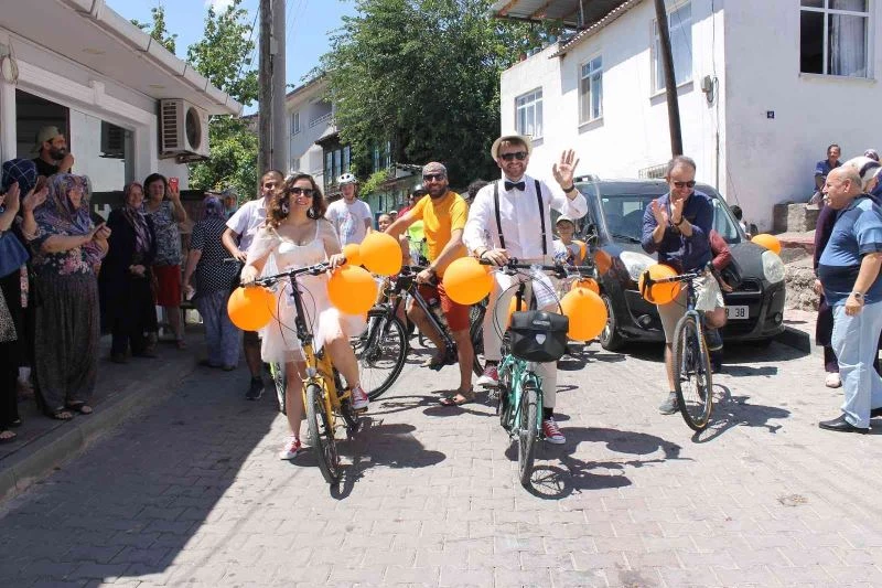 Çanakkale’nin Biga ilçesinde bir çift, bisikletli gelin konvoyu ile dünya evine girdi.