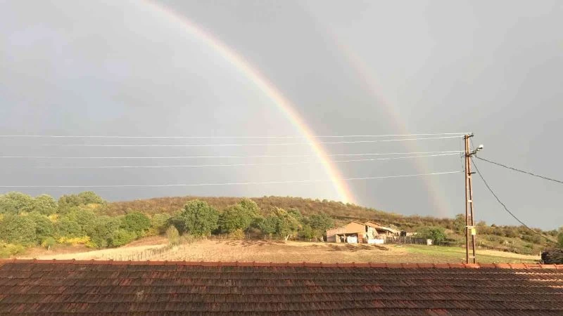 Çanakkale’nin Çan ilçesine bağlı Küçükpaşa köyü ile Büyükpaşa köyü arasında gökyüzünde oluşan çifte gökkuşağı manzarası görenleri heyecanlandırdı.